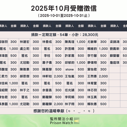 首先,我們完成了最後一場 #2025監所參訪行動,原先預計於8月份舉辦的高雄第二監獄參訪行程,因為颱風而延期,終於在九月上旬完成了今年所有的參訪行動。接下來小組也將彙整參訪資料,舉辦年度論壇,並將完整報告提供予各界參考。