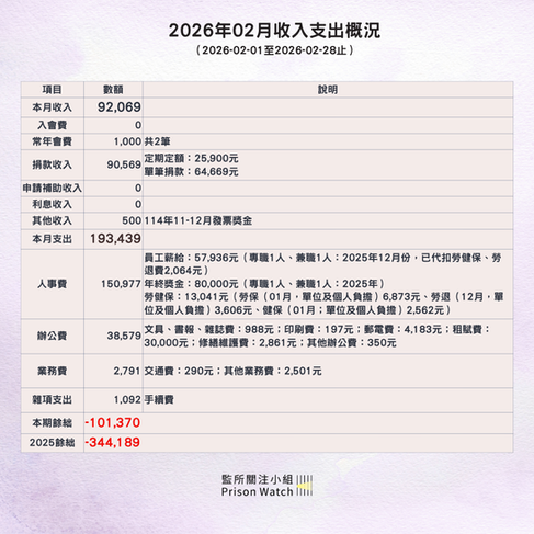 在今(2026)年的一月及二月份,小組持續辦理通信計畫及收容人及家屬支持計畫。除此之外,在一月份,小組夥伴亦參與 #節目錄製 討論 #外役監議題。二月份開始,除了例行舉辦的通信計畫培訓課程之外,小組也於二月下旬舉辦 #在監死亡案件 之 #法庭觀察 活動。另外,小組亦於二月份發布最新一期 #牢獄能解 電子報,以及針對小組之司法專案(113年憲判字第2號)發表投書及進行相關個案之救濟。